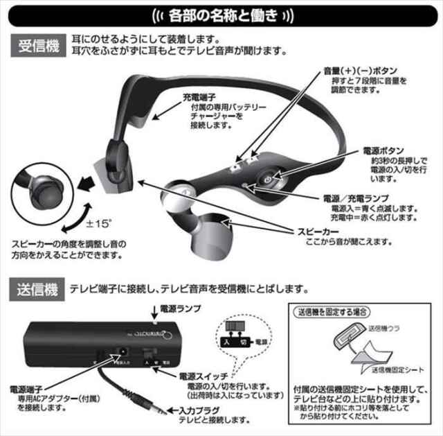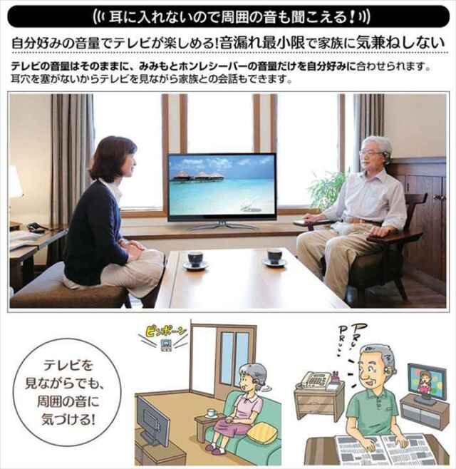 テレビの音がハッキリ聞こえる。耳に一番近い、耳に入れないスピーカー。テレビ音声が聞き取りにくい人にだけハッキリ聞こえる。耳に入れないので、家族と話しながら一緒にテレビが楽しめる。耳との間に隙間があるので、音が鼓膜を直撃せず、鼓膜の負担も軽減される。補聴器との併用でも使える。ワイヤレスなので身動き自由。受信機は充電式で環境にやさしく経済的。【みみもとホンとは】これまでイヤホンやヘッドホンなどを使うとき、耳が痛くなったり、ムレたり、圧迫感を感じたり・・・「耳に入れるのっていやだな」と思った、そんな経験はありませんか?みみもとホンは、これまでの既成概念を打ち破るまったく新しいカタチ!耳穴との間に隙間を保ち、接触しない究極の「耳もとスピーカー」です。特殊構造により、音漏れもほとんどありません。※各仕様については製品の改善などにより予告なく変更することがありますのでご了承ください。※製品の色は印刷インキや撮影条件などから実際の色と異なって見えることがあります。